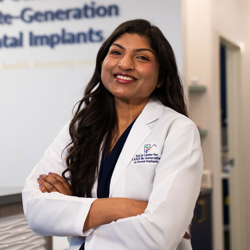 A committed dentist, Dr. Mohan prides herself in providing state-of-the-art treatment to her patients in a safe, comfortable, and relaxed environment at Socal center for LASER Re-generation & Dental Implants. She loves building long-lasting relationships with her patients and enjoys working with patients of every age group. She enjoys working on all facets of dentistry, but especially loves helping patients with failing dentition and/or implants using LASERs. She sees Gum disease as the Trojan horse for good overall health.
